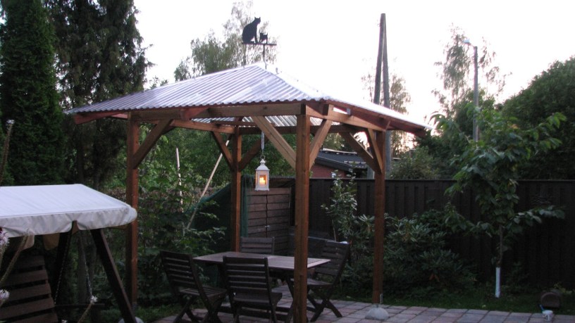 Valmis katos tuntui ajavan asiansa. Katos ei tunnu asettavan uusia esteitä pihalle, sillä sen ali pystyy liikkumaan vapaasti. Vastaavasti katoksen alla pihatavarat pysyvät siisteinä ja katoksessa voi istua myös vähän huonommallakin säällä.