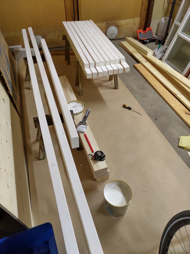 Runko sahattiin mittoihin ja pohjamaaliin autotallissa, jonka jälkeen mittoihin sahatut osat oli nopea kiinnittää paikoilleen ja sutia päälle lopullinen maalikerros.