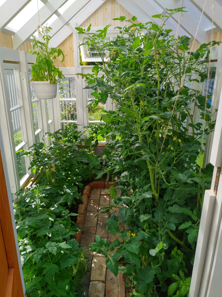 Vaikka ensimmäisen kesän istutukset pääsivätkin käyntiin vasta melko myöhäisessä vaiheessa, satoa tuli jo kohtalaisesti. Toki valtaosa tomaateista jouduttiin lopulta ottamaan kypsymään sisätiloihin. Kasvihuonesta tuli myös ihan sympaattinen pikku mökkerö pihalle. Ja mikä parasta, käsityönä tehdyt ikkunat saivat uuden elämän!