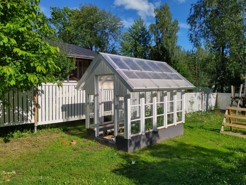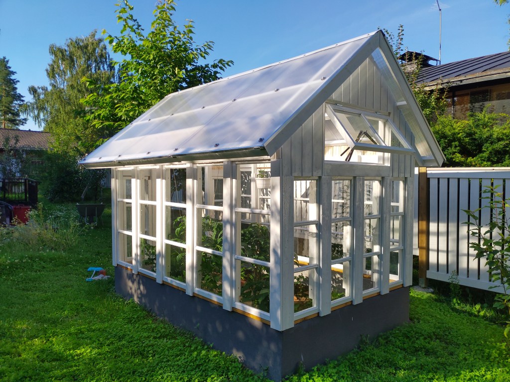 Kasvihuone omalla pihalla antaa lisää mahdollisuuksia kotiviljelylle. Lisäksi kun varastoissa oli joutilaana nippu vanhoja ikkunoita, niiden ottaminen hyötykäyttöön osana kasvihuonetta tuntui suorastaan velvollisuudelta.